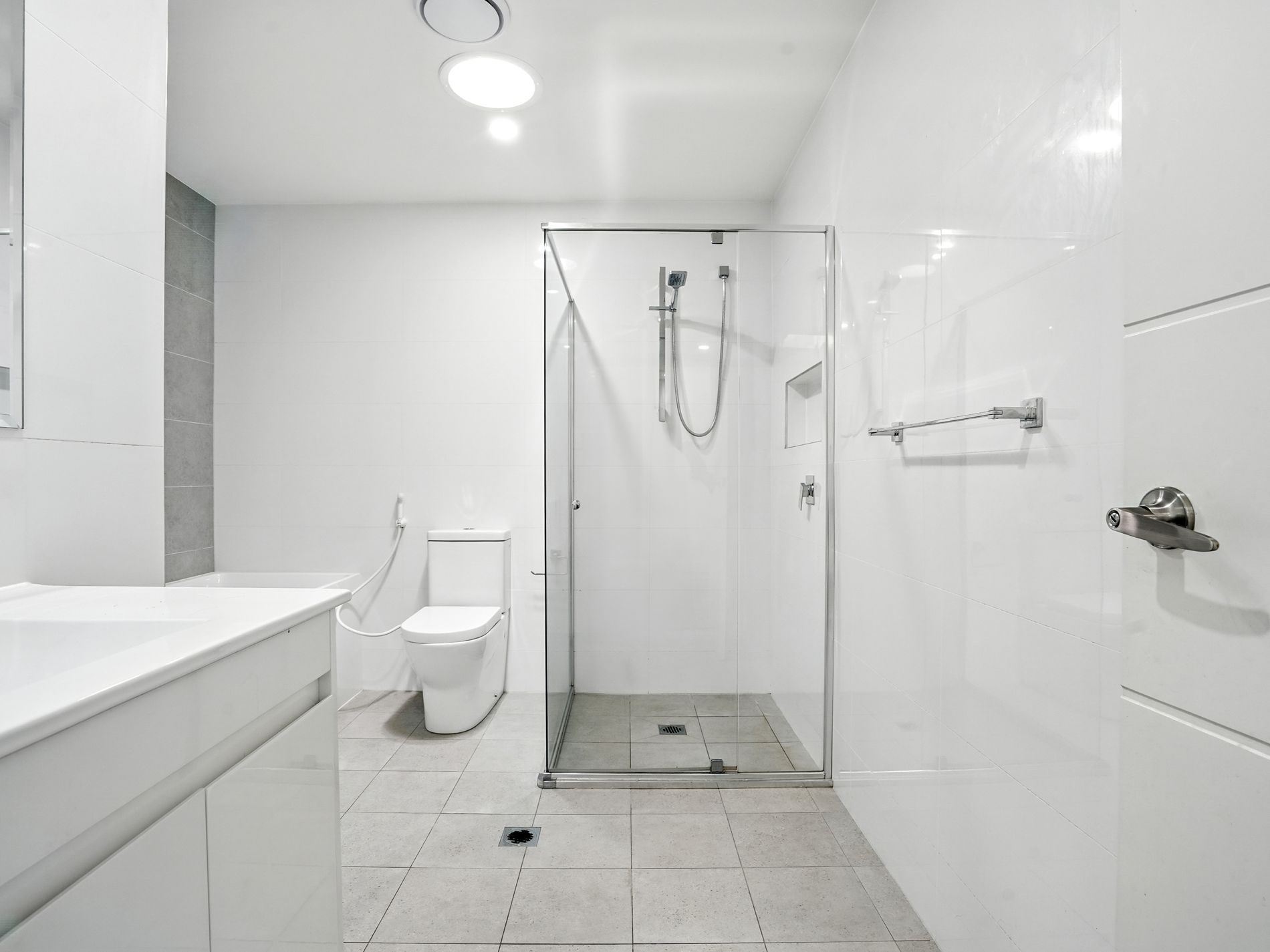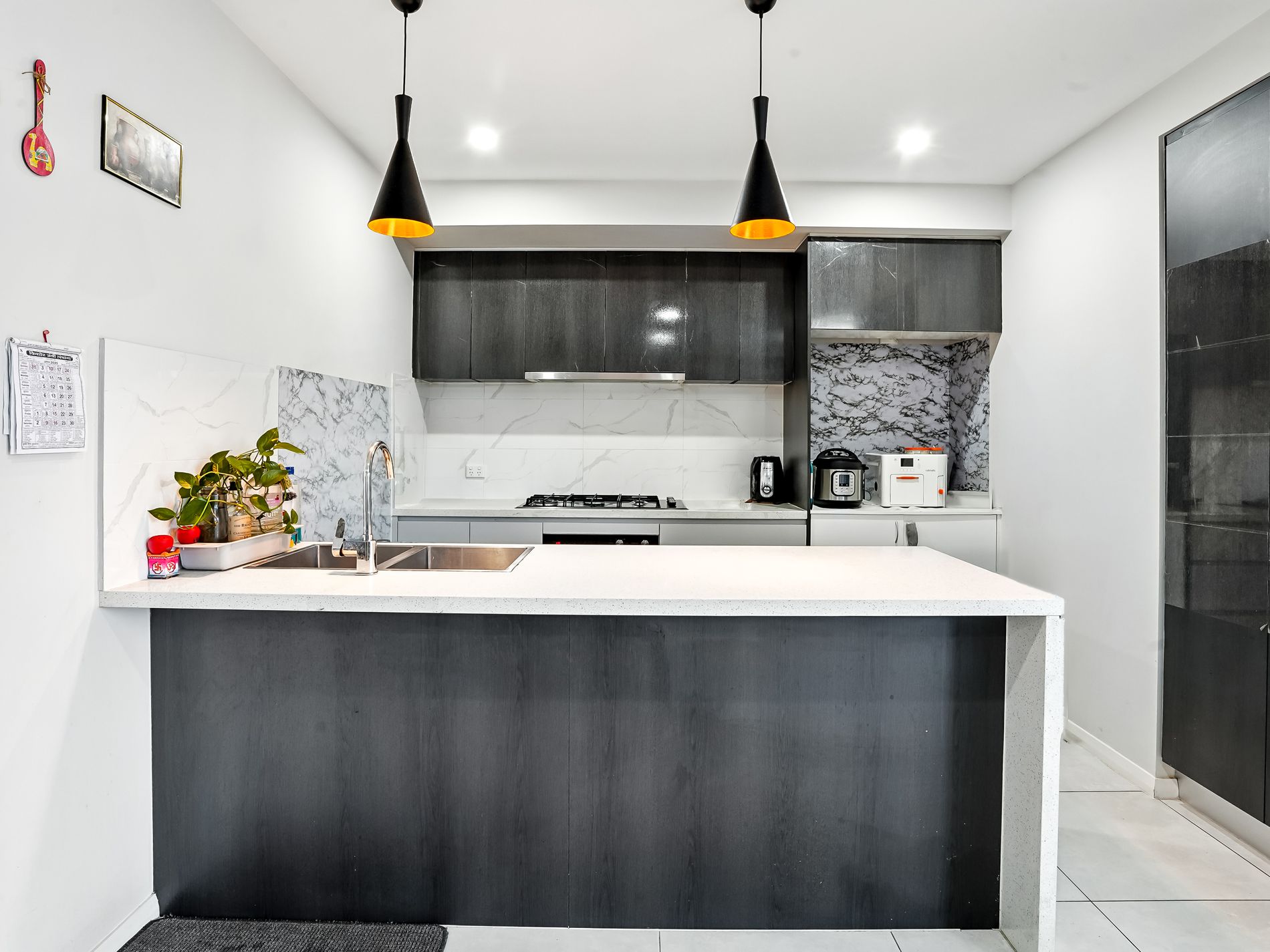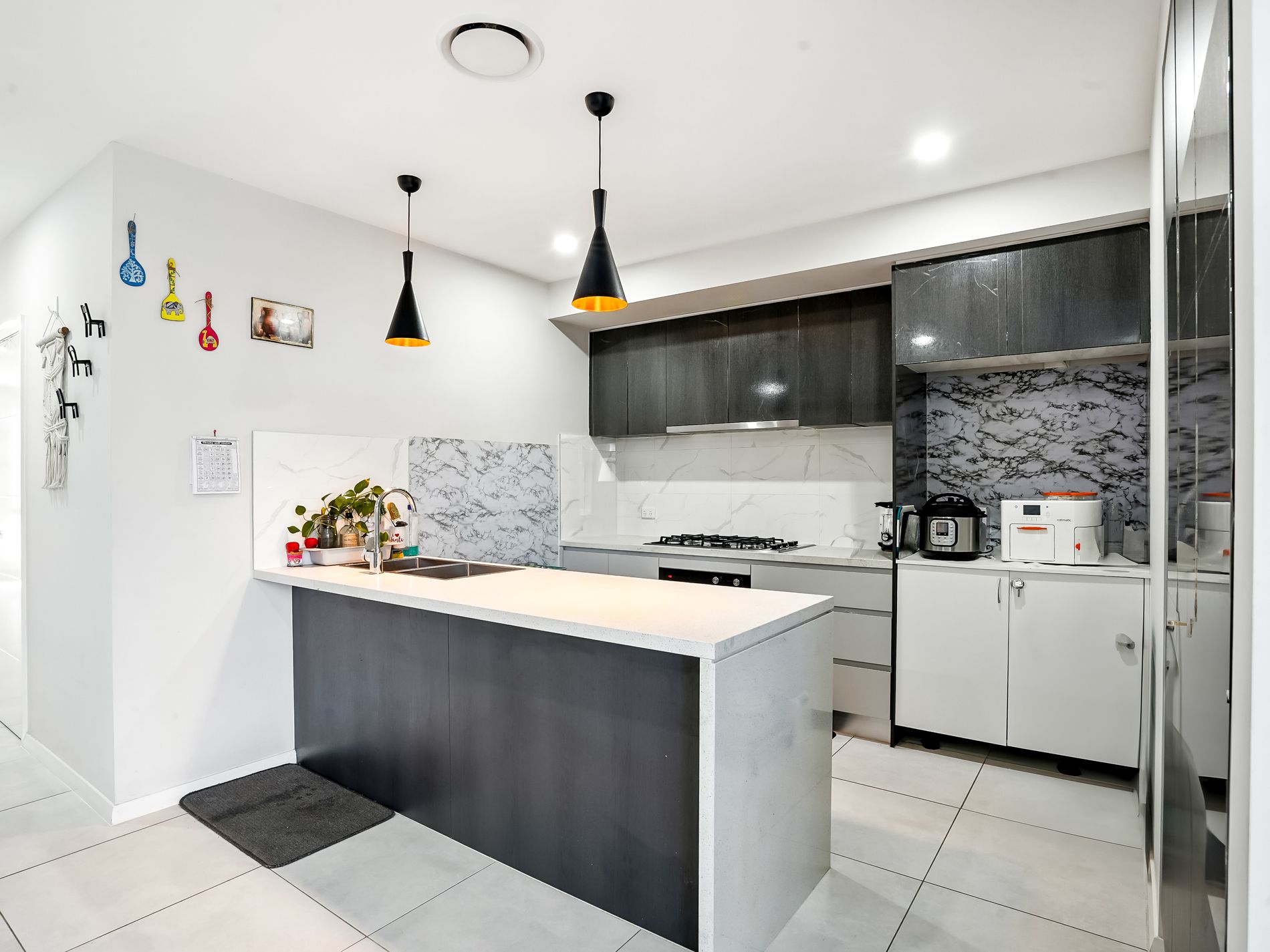 -Modern Aesthetics: Large-format tiles downstairs, quality hybrid flooring upstairs, and LED downlights with customizable color modes.