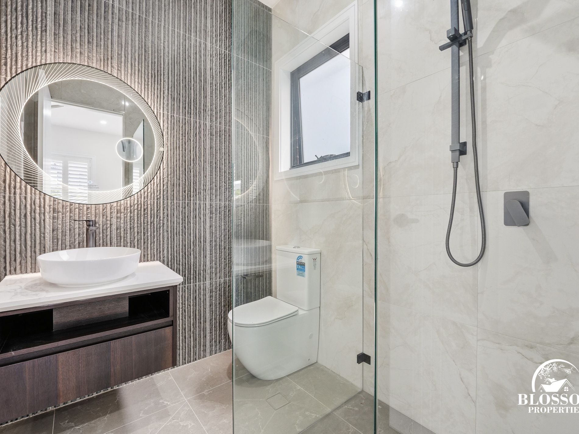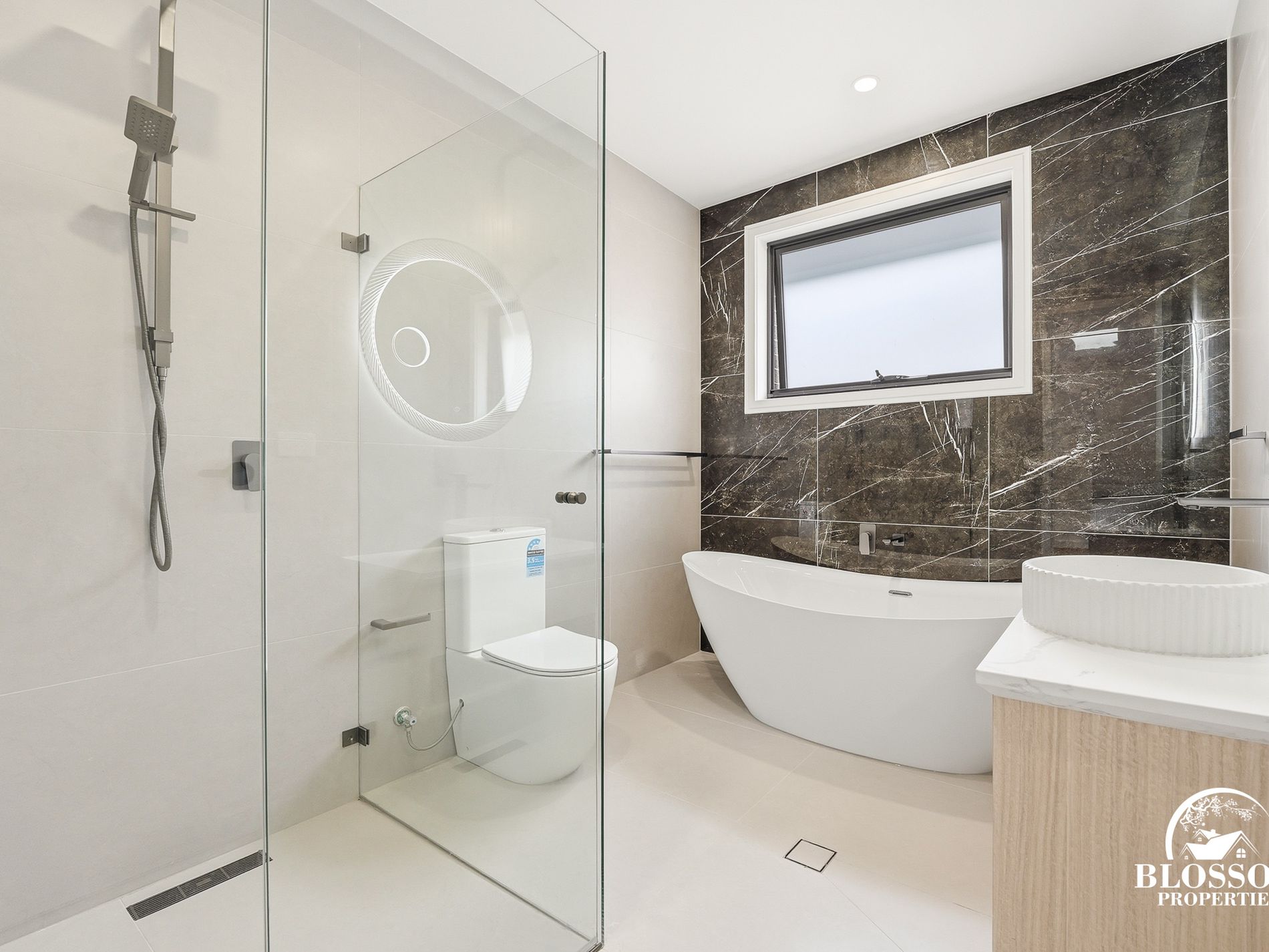 -Frame less glass shower screens and heated bathroom lights