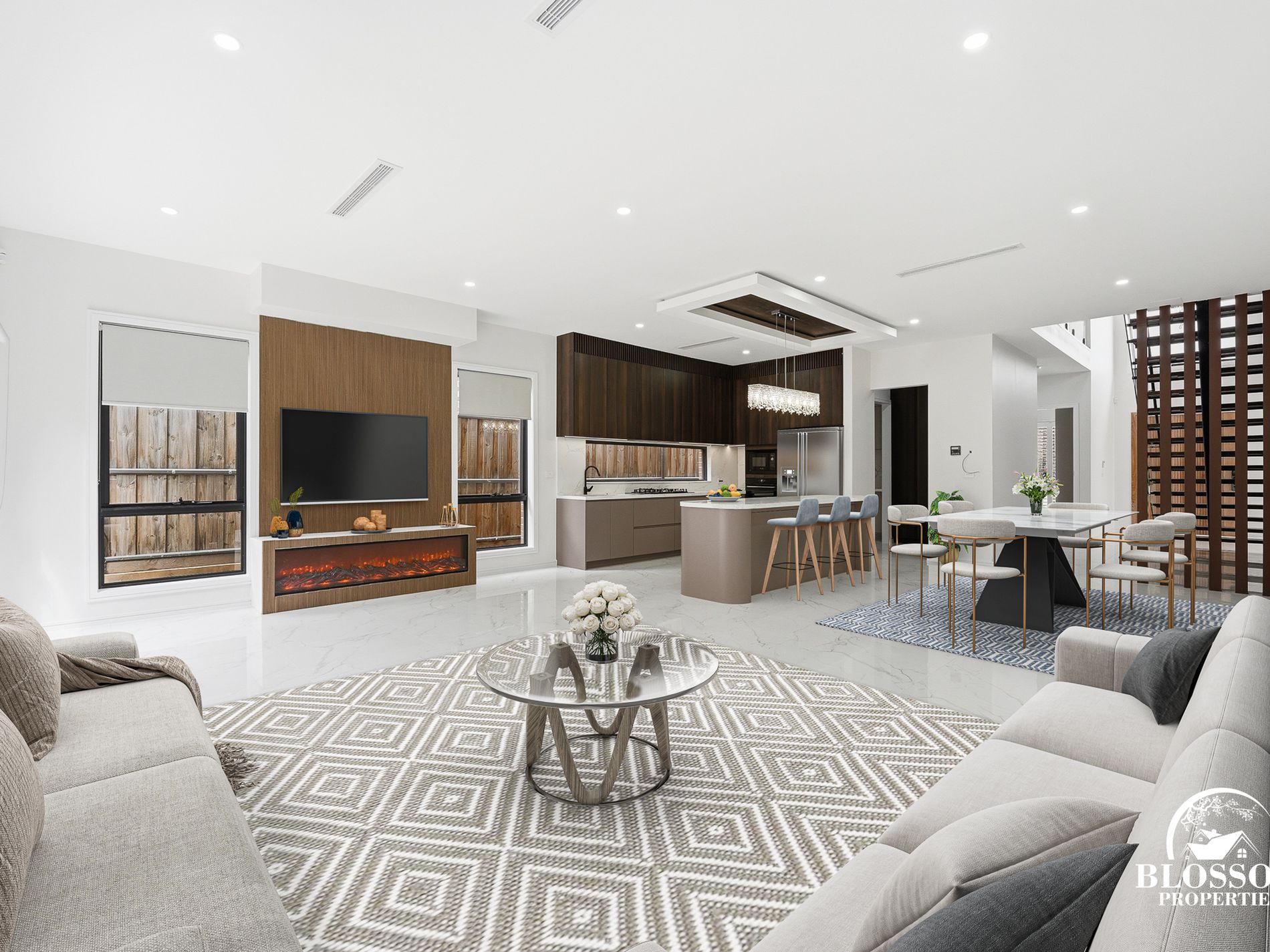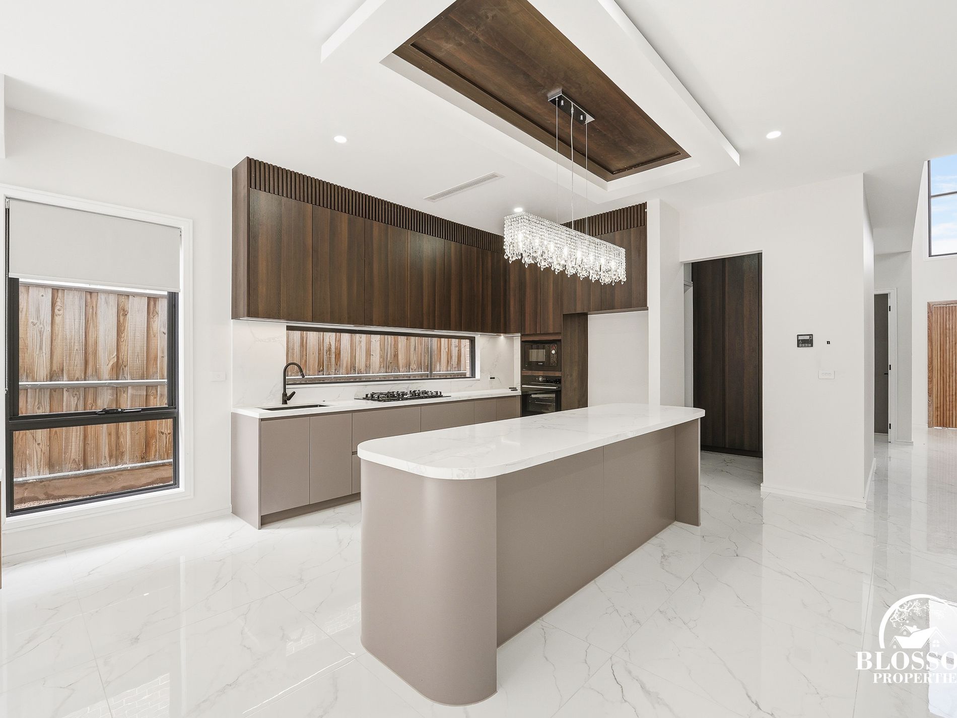From the moment you arrive, the striking multi-textured façade creates an unforgettable first impression. Step through the oversized solid timber pivot door into a breathtaking double-height void foyer, where natural light and a stunning statement chandelier create an immediate sense of grandeur. A spectacular floating timber staircase with frameless glass balustrades and integrated LED lighting forms the architectural centrepiece of the home, setting the tone for the quality and sophistication that continues throughout.